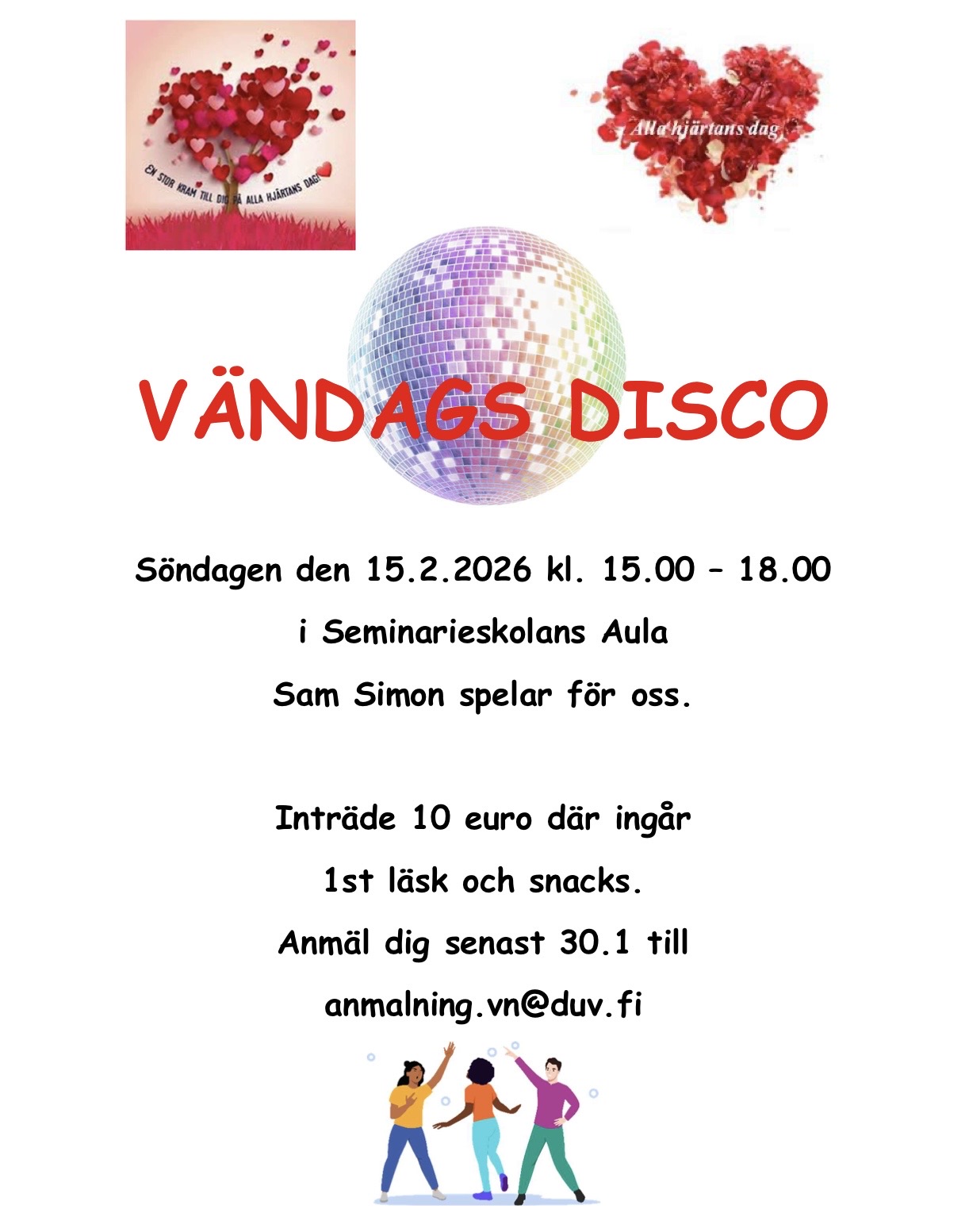 Vi ordnar vändags disco söndagen den 15.2.2026 klockan 15.00 – 18.00 i Seminarieskolans Aula.